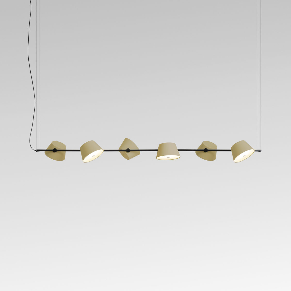 Die verspielte und originelle Tam Tam zeichnet sich durch eine besondere Dynamik und ausdrucksstarke Farben aus. Die umfassende Kollektion ist in verschiedenen Ausführungen erhältlich – Pendelleuchte, Wandleuchte und Stehleuchte – und hat bisher auf intensive Farben gesetzt, um Raum einzunehmen und Akzente zu setzen. Rund ein Jahrzehnt nach ihrer Entwicklung wurde die Leuchte nun überarbeitet, um ihre Möglichkeiten zu erweitern. So wurde die einst glänzende Oberfläche durch ein semimattes Finish ersetzt und es gibt dezentere Farben wie Silbergrau und Olivgelb.