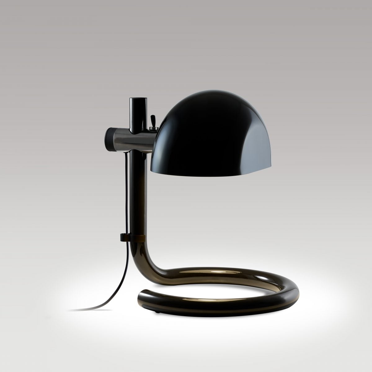 Dieses Design vereint Vergangenheit und Gegenwart, wobei die Neuauflage dem Original treu bleibt: Der Sockel und der Schaft sind in den Farben Chrom und Kohle verfügbar und aus Stahl gefertigt, einem Material, das früher vor allem in der Industrie weit verbreitet war. Das Bearbeiten von Stahl war in den 1970er-Jahren eine anspruchsvolle Aufgabe, die nur die Innovativsten angingen – und auch heute erfordert sie großes Können. Lauro schlägt eine Brücke zwischen Vergangenheit und Gegenwart, indem sie an die Errungenschaften erinnert, die bereits vor einem halben Jahrhundert Maßstäbe setzten. Der Schirm ist in einer Ausführung aus lichtdurchlässigem, opalweißem Methacrylat erhältlich, die den Raum mit diffusem Licht erfüllt, und in einer Ausführung aus doppelschichtigem Schwarz, die für direktes Licht sorgt.