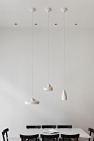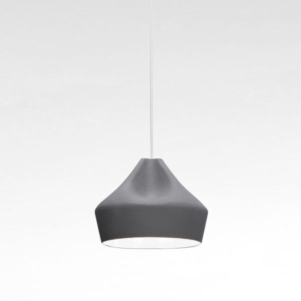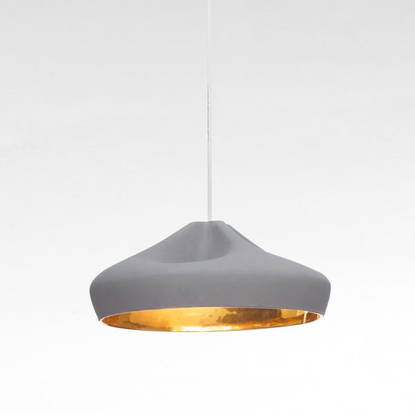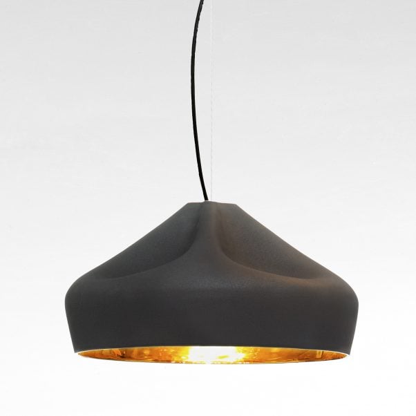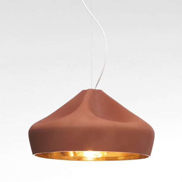 The outer part of the lamp is offered in white ceramic, brown, black, terracotta, and grey– the direct result of recycling different enamels. The interior is available in brilliant white enamel, which enhances the luminous light from the lamp, or 24k gold, which generates an extremely warm light.