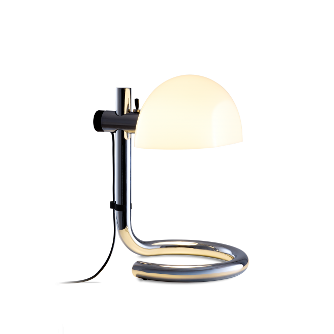 Este diseño aúna pasado y presente, su reedición es fiel a la original: la base y la tija disponibles en color cromado o carbón, son de acero, un material difícil de moldear, propio de la industria de ese momento. En los años setenta conseguir curvar acero era innovador, un grandísimo reto, y hoy lo sigue siendo. Por eso Lauro es también un diseño actual, porque pone en valor los logros conseguidos hace ya medio siglo. La pantalla de metacrilato está disponible en opal traslúcido proyectando luz difusa, o bien en negro bicapa para aportar luz directa.