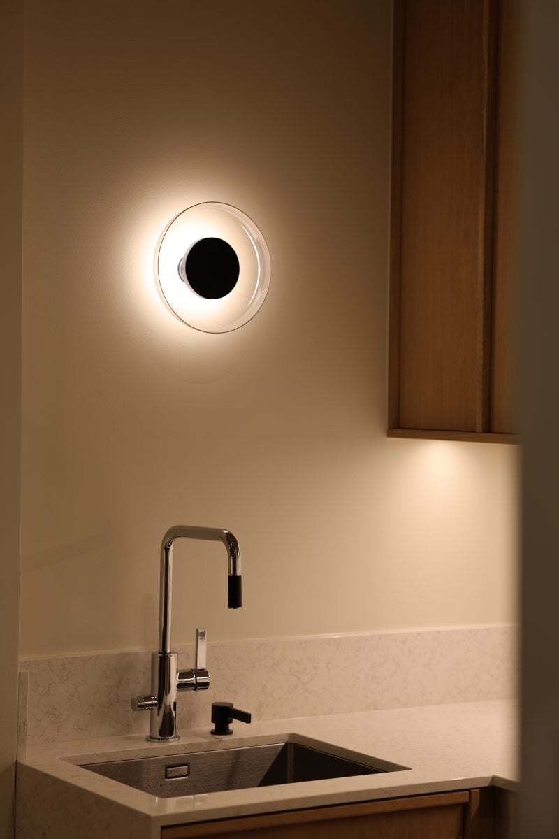 Aura se presenta en dos tamaños: 18 y 25 cm de diámetro, para aportar soluciones lumínicas a espacios más pequeños o más grandes. Este aplique liviano y resolutivo debe guardar la proporción idónea en el interior que tenga que iluminar, y la proporción siempre depende de la escala.