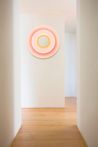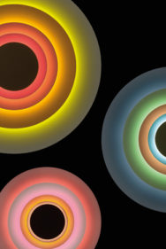 La colección Concentric parte de un trabajo artístico que resalta esa interacción entre la luz y la reflexión del color, ya que cada placa circular blanca juega con un color diferente en su reverso. A la luz del día, estos colores se perciben sutilmente, pero es durante la noche, al encenderlo, cuando toman mayor fuerza y brillan formando efectos de luz cromáticos complejos.