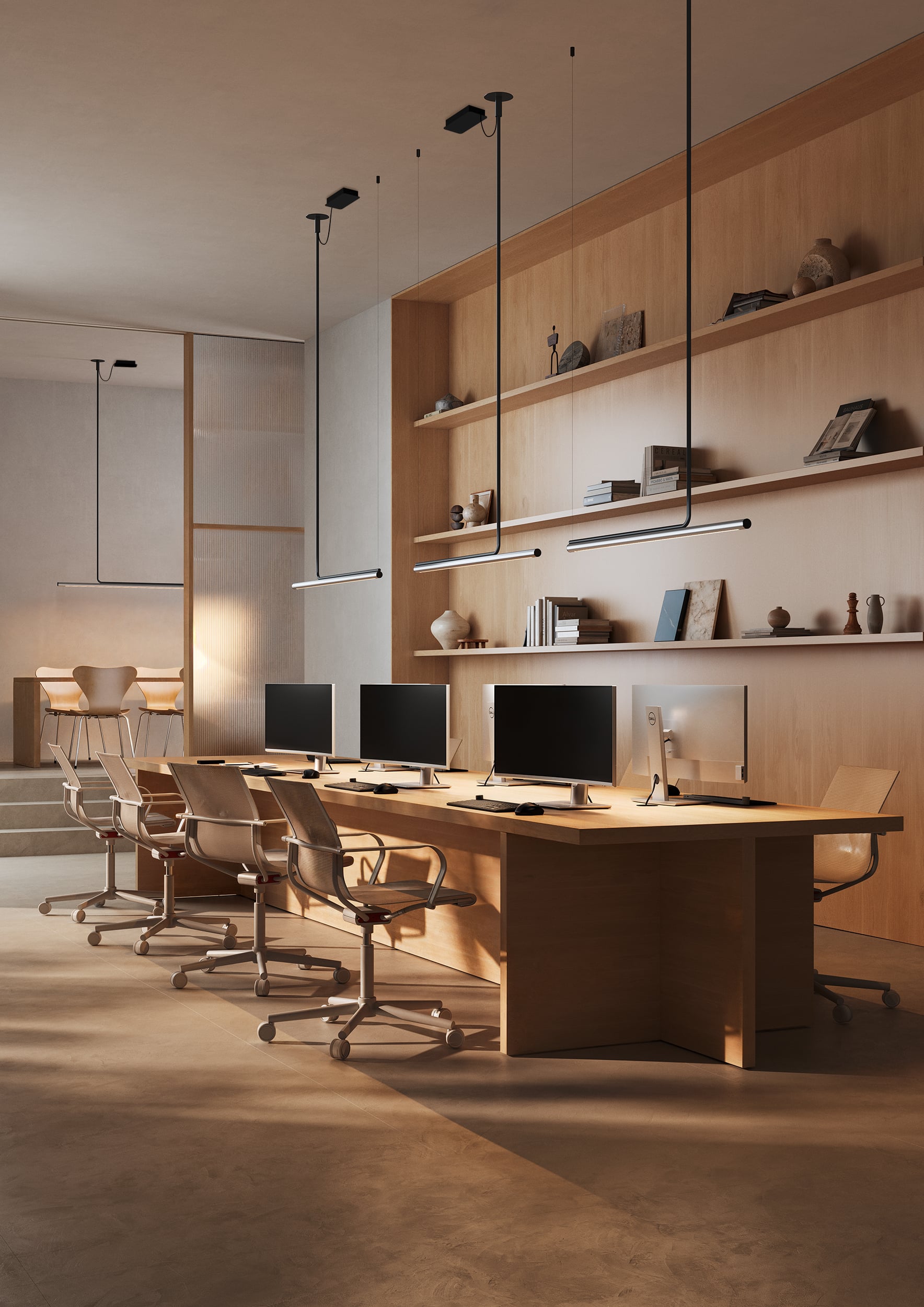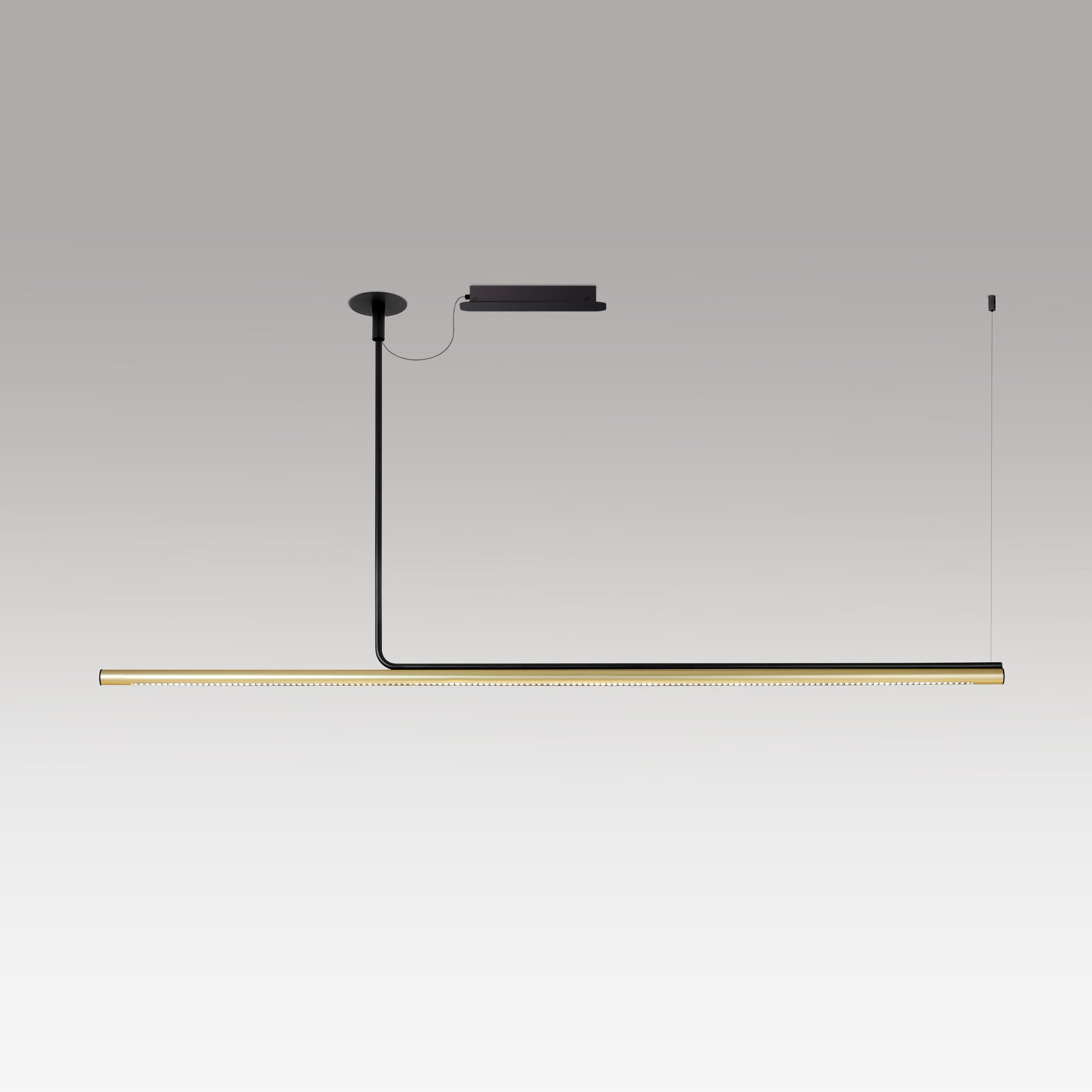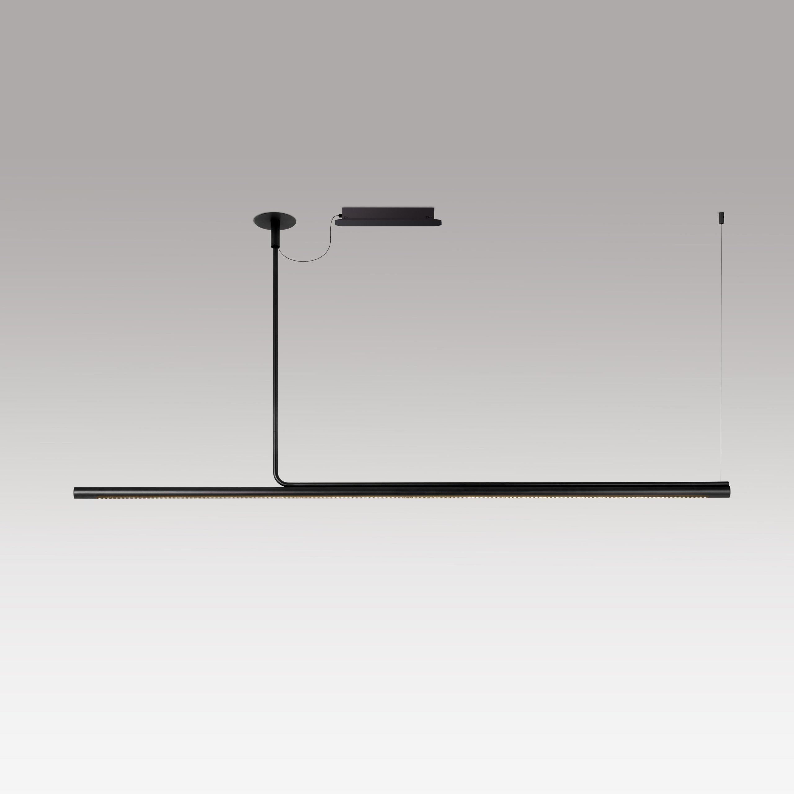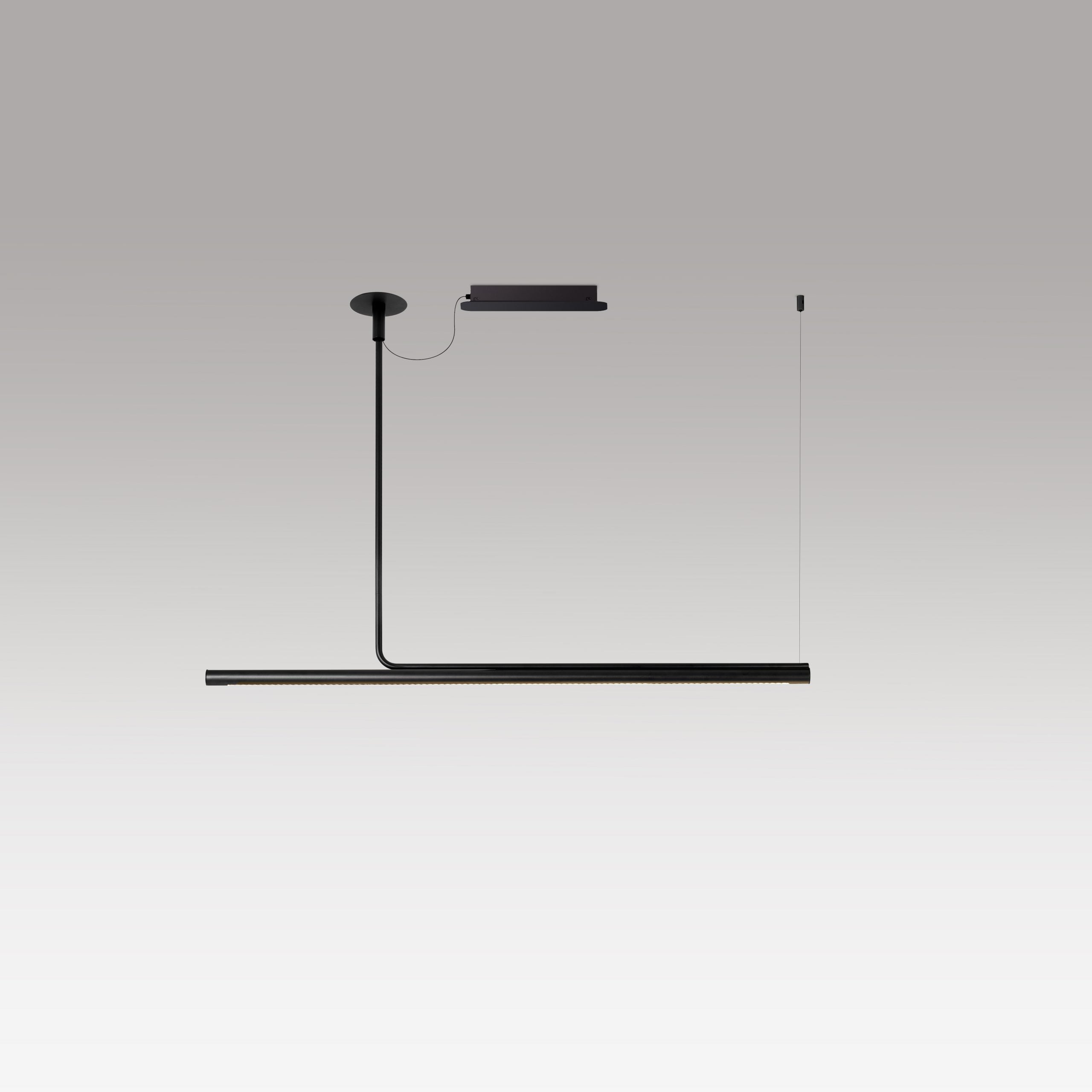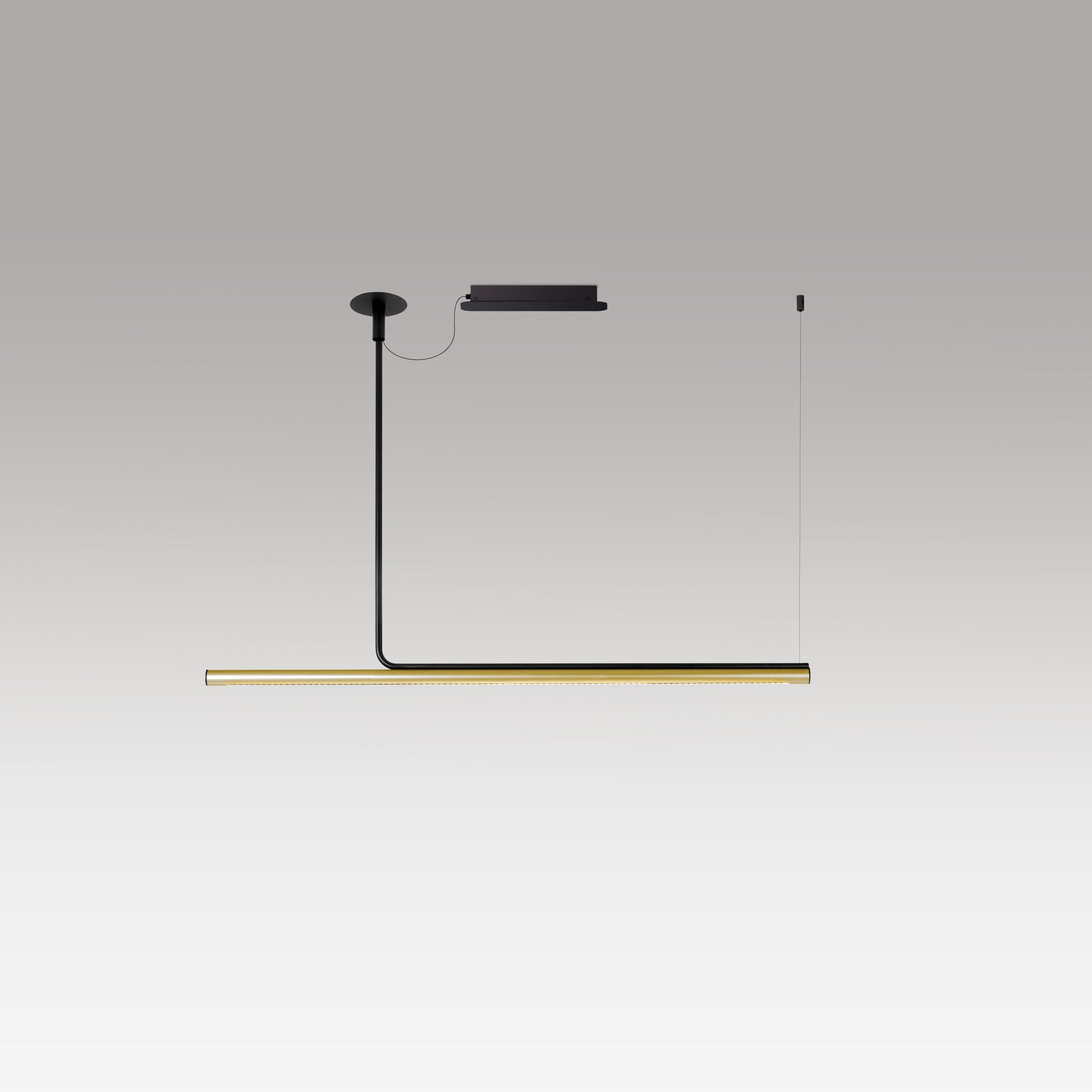 This collection has been extended with a version designed specifically for workspaces that require more controlled lighting. Ambrosia Pro includes a cell structure with independent lenses that project more directional lighting. This edition speaks the same language as the rest of the collection but is perfect for different applications. It is available in a horizontal suspension versionin two lengths—120 and 180 cm— and in in three finishes: gold, stainless steel, and black. – while the extension that fixes it to the ceiling is always in black.