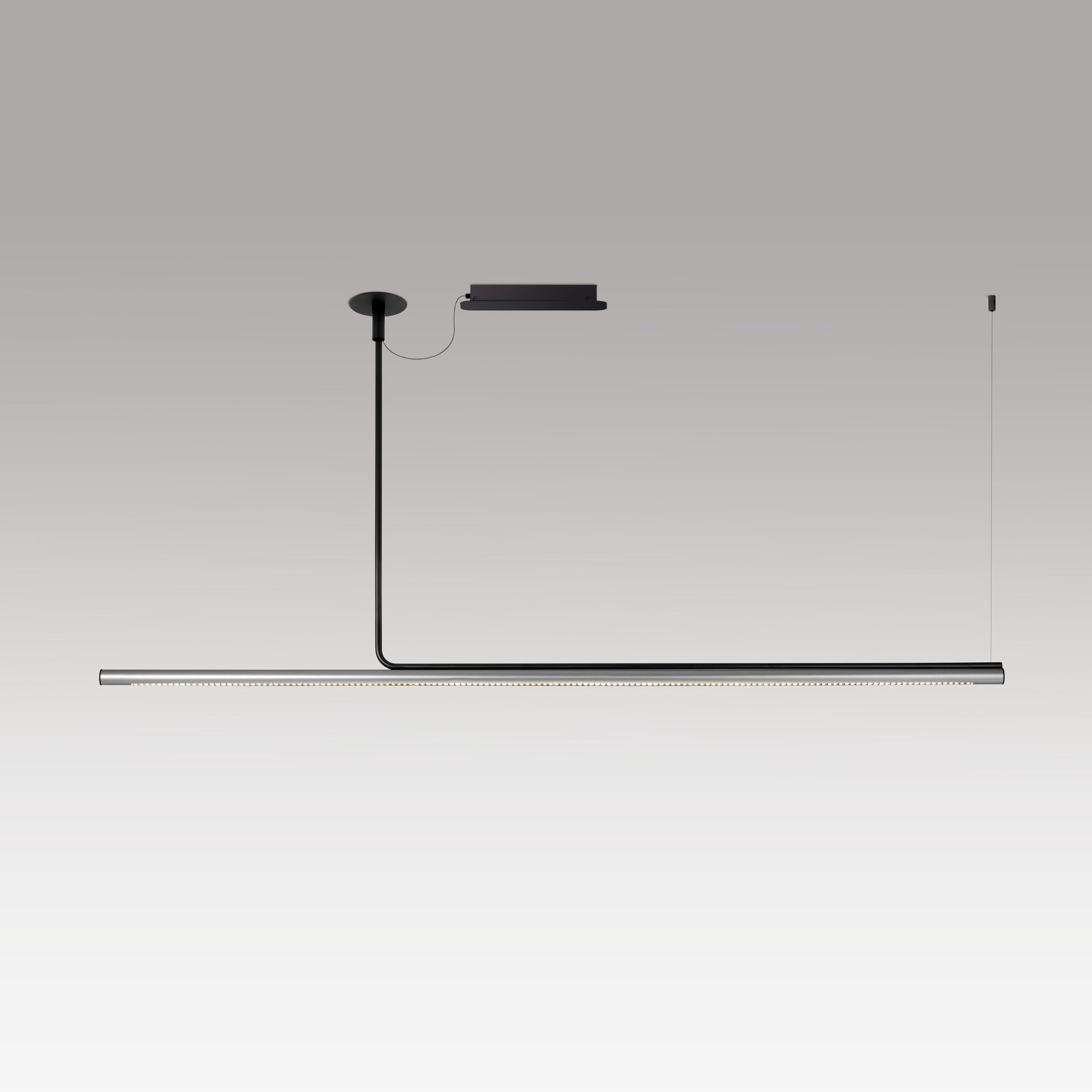 This lighting system is available in four pre-set lengths, from 47 to 124 inches. Extensions measuring 16 and 24 inches let you define the height from which to hang them. That way, you can adjust their distance from the ceiling to create visually uninterrupted compositions.