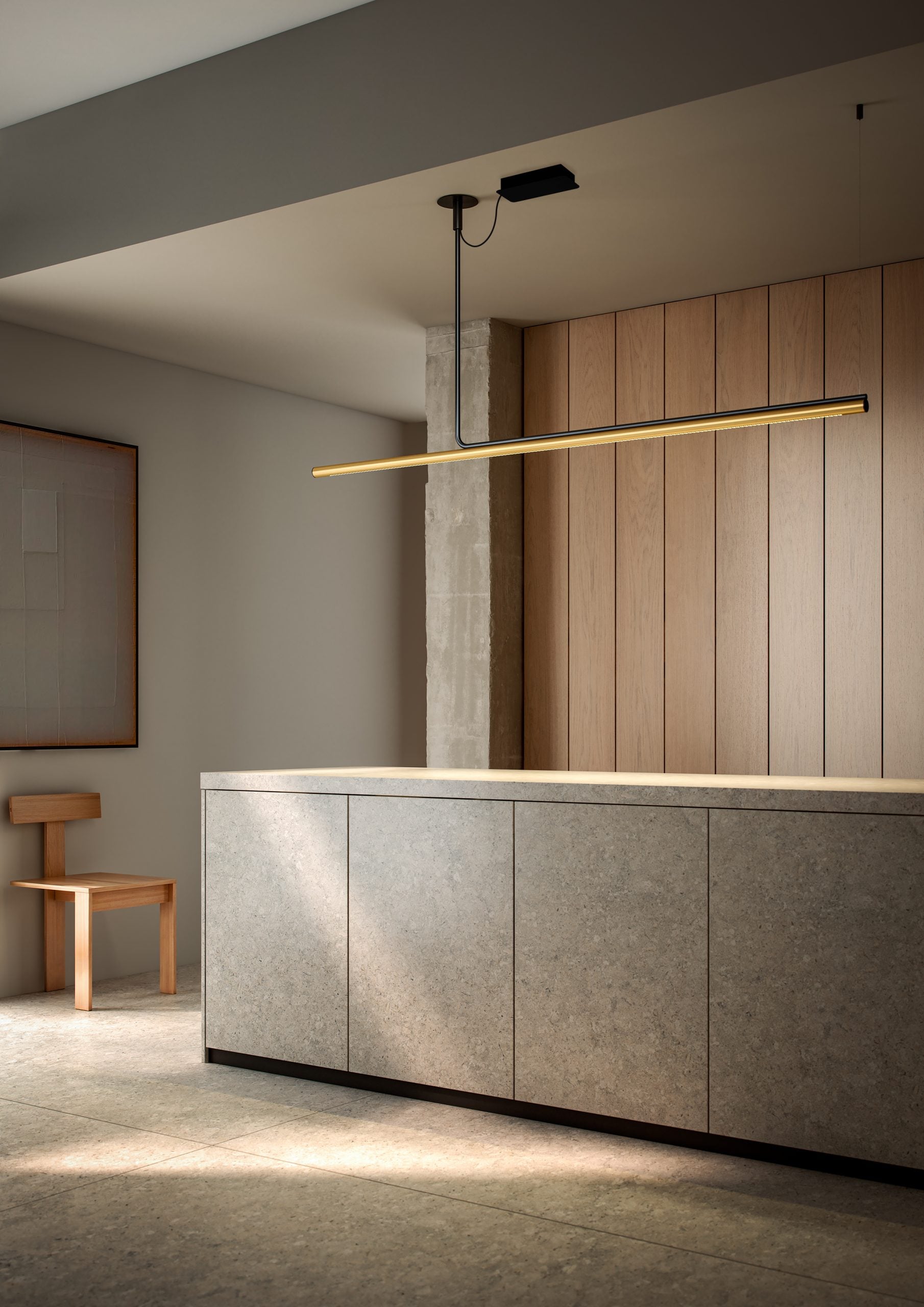 Its design stems from a tubular structure with gentle lines that attaches to the ceiling, allowing the light to descend and gently illuminate any type of project. It is this diffuse light that fills the space, adding beauty.
