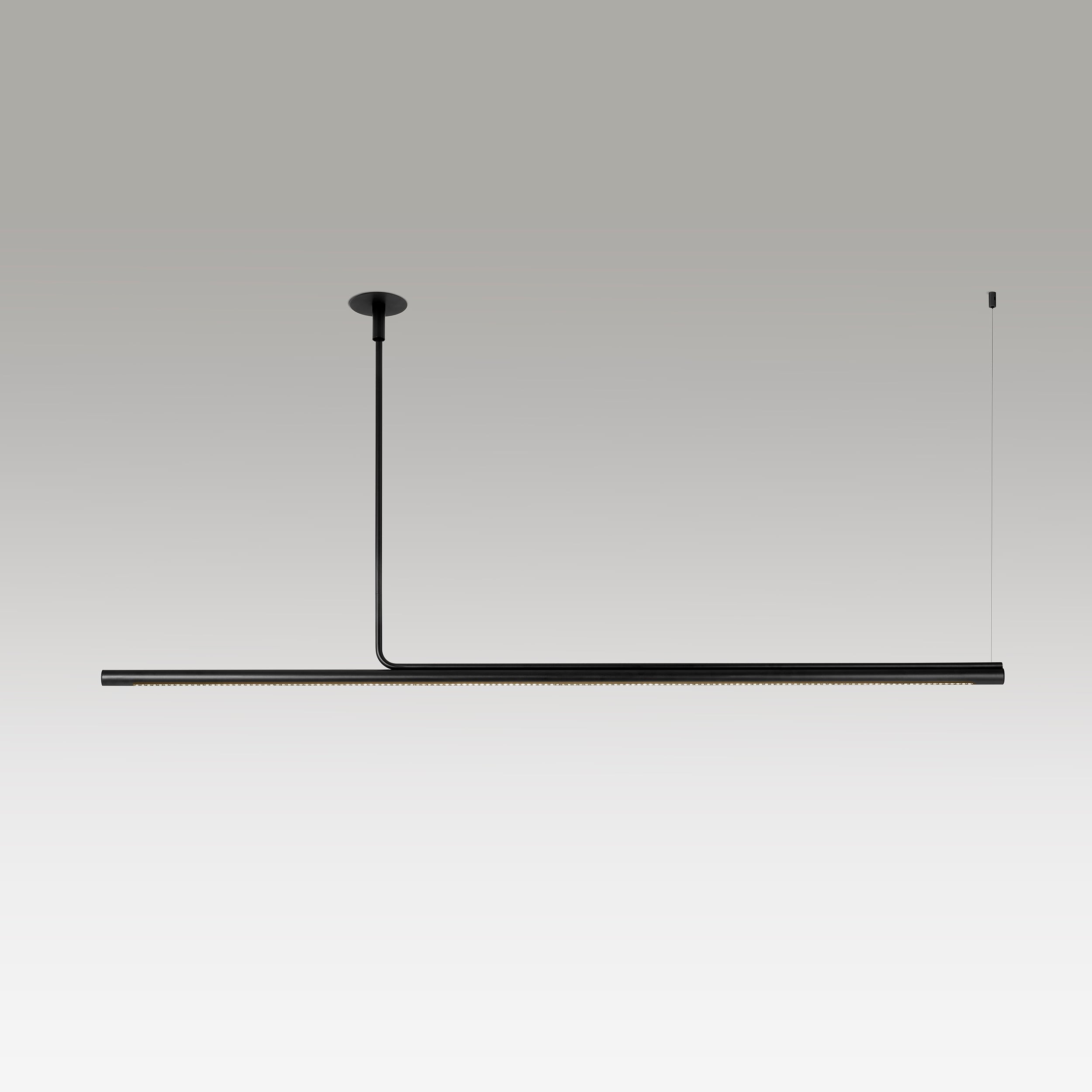 This collection has been extended with a version designed specifically for workspaces that require more controlled lighting. Ambrosia Pro includes a cell structure with independent lenses that project more directional lighting. This edition speaks the same language as the rest of the collection but is perfect for different applications. It is available in a horizontal suspension versionin two lengths—120 and 180 cm— and in in three finishes: gold, stainless steel, and black. – while the extension that fixes it to the ceiling is always in black.