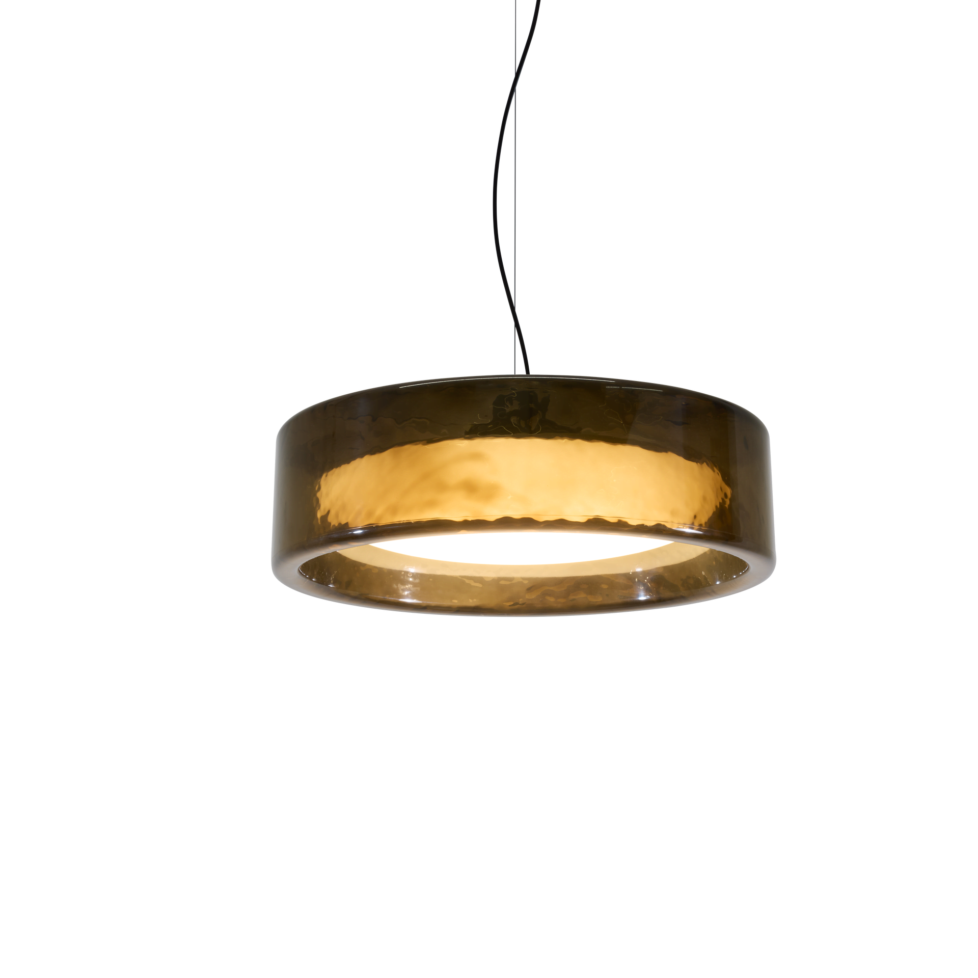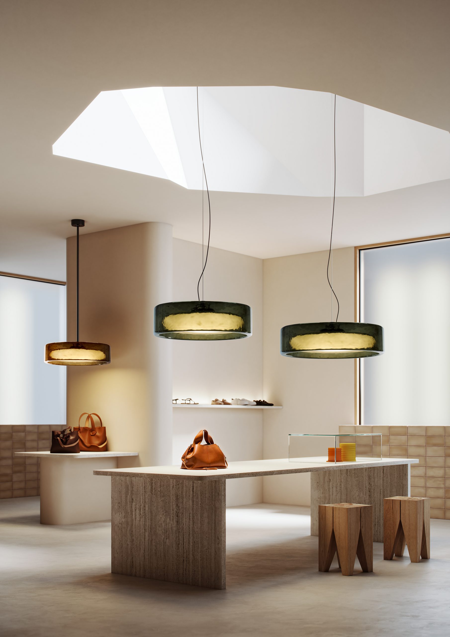 Available in a ceiling version (with a fixed pole or built-in) and a pendant version, in two sizes, 27,6 and 35,4 inches, and in four finishes: green, rosé, smoke, and dark smoke. Height extension poles of 15,7 and 23,6 inches allow you to increase the drop length from the ceiling while retaining the rigid stem. It also has three colour temperatures: 27K, 30K and 40K.