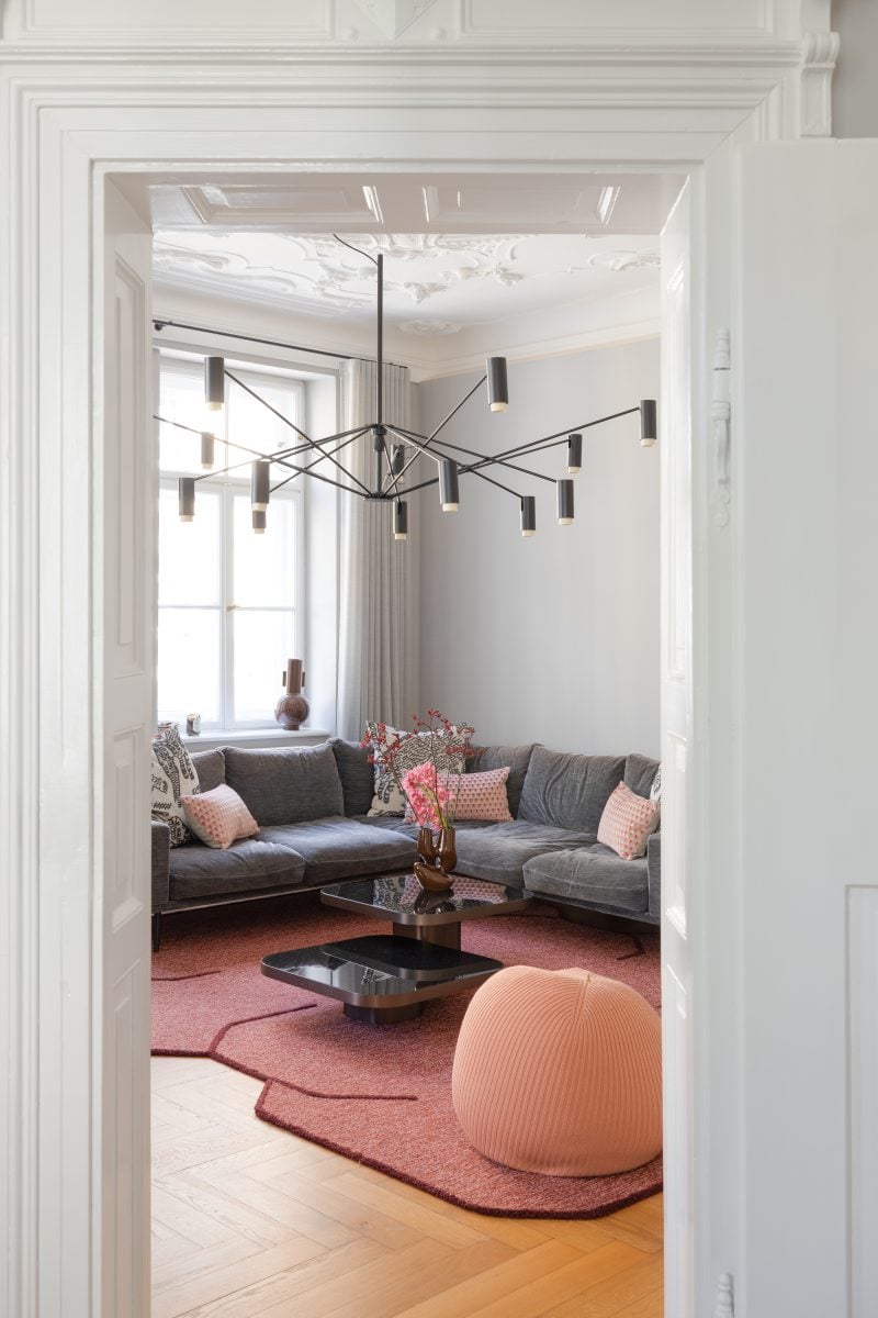 A large black vertical structure is the main shaft from which fourteen rods emerge; some can be moved upwards to expand the light and others downwards to focus it. The rods all have a suspended spotlight that projects the light downwards or in a large, sharp beam. The cylindrical spotlights – with an inner ring that comes in ivory, terracotta or gold – spread the light evenly.