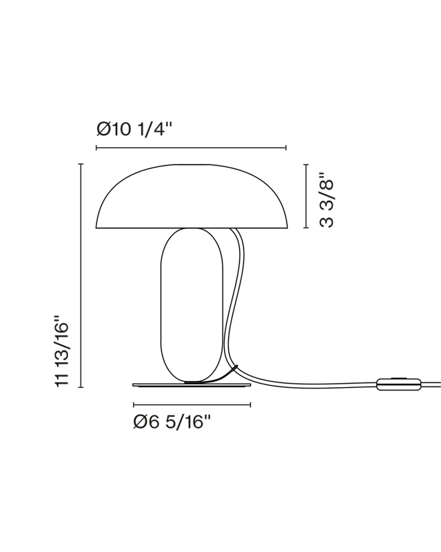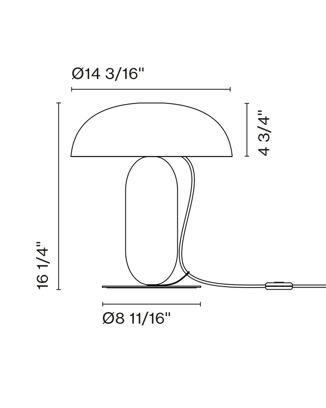 However, the beauty of this table lamp doesn’t come solely from its composition; it’s defined by its palette of colours. The shade is available in pale pink or black, opaque versions that provide a direct light, or in opal methacrylate for softer illumination. The stem is available in orange and moss grey and the base in stone grey. This range of colours has created a matrix collection of different versions, each with their own aesthetic, from subdued to more expressive. It’s available in two sizes: 10,2″ in diameter and 11,8″ in height, and 14,1″ in diameter and 16,1″ in height. The cable also forms part of the lamp’s design, descending from the top while a clip guides it, anchors it and stops it from escaping, adding to the overall visual appeal.