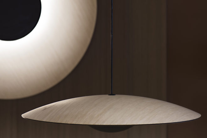The lighting was an essential part of this project, and the main lamp chosen was Marset’s Ginger model, designed by Joan Gaspar, a piece made of pressed oak wood with a concave metallic module housing the lamp, which gives off an indirect light that helps to define the personality of the space. Different versions of the Ginger lamp have been used: suspension, table, wall and suspended with an arm.